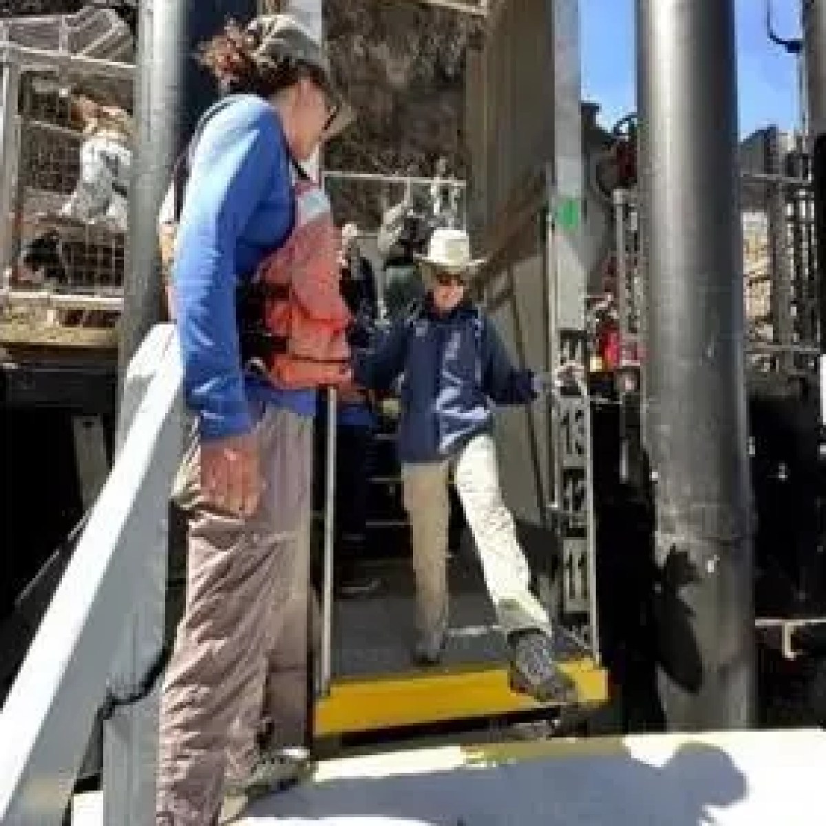 This requires visitors to climb down a boat ladder of 4-5 feet to a skiff or small boat. Then visitors must climb out of the skiff onto wet sand, and potentially ankle deep water.