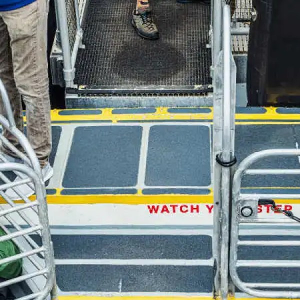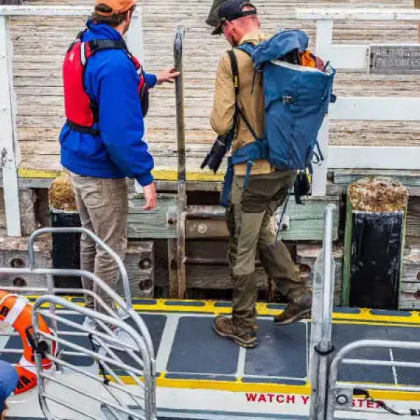 Visitors must offload from a live boat (not tied-off or anchored) to an adjustable platform on a pier. At the landing platform, there is a ramp that provides access to the top of the pier.