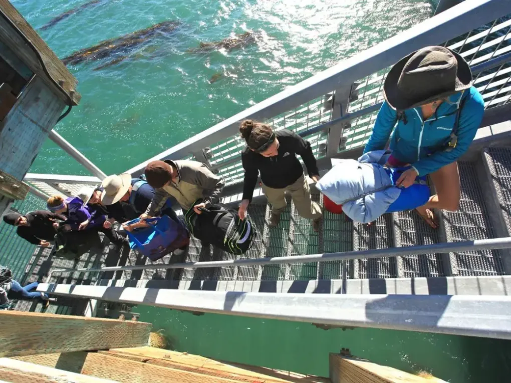Accessing Anacapa Island requires a degree of agility. Visitors must offload from a live boat (not tied-off or anchored). Passengers step from a moving boat onto a stable platform with the assistance of a crew member, then climb a vertical ladder up to 8 feet tall depending on the tide.